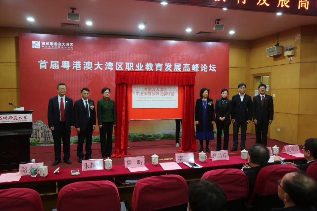 论坛开幕式上,李心、鲁昕、朱超华、凌靖波、骆少明、李子建(香港教育大学副董事长)、张沁(香港可持续发展教育公司经理)共同为刚成立的“粤港澳大湾区职业教育教师发展联盟”牌匾揭牌。