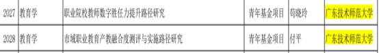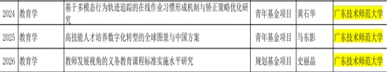 近日,教育部社科司关于2023年度教育部人文社会科学研究一般项目评审结果公示,公司5名老师(黄石华、马东影、史丽晶、苟晓玲、付平)所申报项目获立项公示,属广东技术范大学本年度拟立项公示最多的二级单位。