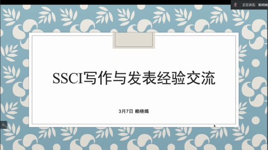 赖晓嫣副教授就本次会议主题分享了三大经验。首先引用自己的博士论文框架阐述了如何发现一个具有新意的研究主题、如何从较宏观的研究主题中挖掘与延伸出具体的研究问题,从而取得高数量与高质量的学术论文。而后通过自身科研合作的实际案例来剖析合作的重要性,并从自我定位、合作关系维持等方面分享科研合作的具体方法。最后又向我们展示了如何开始接触并深入研究某一具体领域,系统地论述了如何产出一篇高质量的外文学术论文。除此之外,还介绍了学术研究中自学的一些科研技能、较高效的科研工具与外国杂志投稿注意事项。