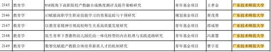 近日,教育部社科司关于2024年度教育部人文社会科学研究一般项目评审结果公示,公司6名老师(黄茂勇、冯嘉慧、曹宇星、邵成智、郭腾飞,王孝金)所申报项目获立项公示,属广东技术范大学本年度拟立项公示最多的二级单位。