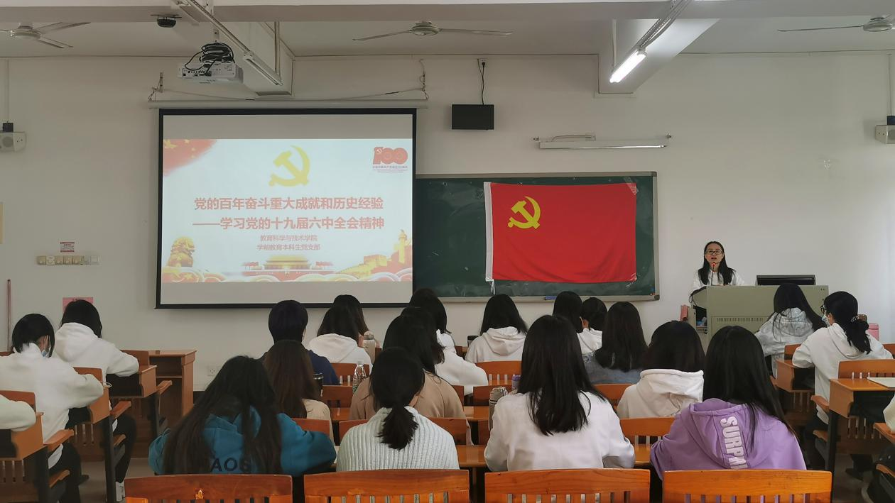 十九届六中全会是在“两个一百年”奋斗目标历史交汇关键节点上召开的一次重要会议,通过党支部专题学习,全体党员更加深知党的成就来之不易,更要保持清醒的头脑砥砺向前。青年学子,要坚持不断学习党史,并联系当下我国的发展现状,从中国共产党的百年奋斗历史中,不断学习经验,为新时代的各项建设贡献青春力量,为成为有信仰、肯奋斗、敢担当的青年员工而不懈努力。(学前教育本科生党支部供稿)