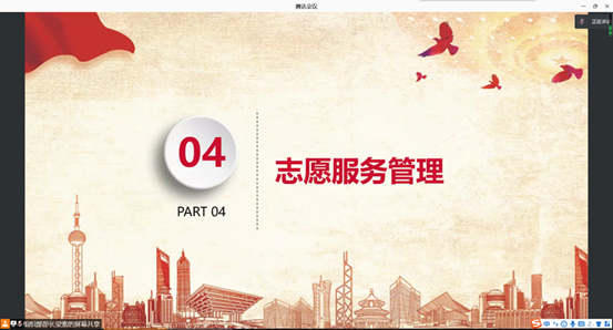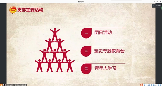 紧接着是公司团委组织部部长梁素的发言。她对团支书做出了有关于团日活动、党史专题教育会和青年大学习三个方面的要求。首先是各团支部的团日活动,她希望各团支部都能够认真对待每一次的团日活动,并通过视频、文字总结以及活动后公众号的发布,认真记录活动的全程。其中着重强调了“活力在基层”的团日活动比赛,希望各团支部都能积极参与到其中。其次是党史专题教育会,她指出,各团支部都应当积极进行各种党史学习教育,如专题学习会,以各种形式让本班的团员与非团员都能够对党史产生兴趣,让每个团支部都焕发红色生机。最后是青年大学习团课的进行,她提到,全院的团支书应当积极督促本团支部成员进行青年大学习线上团课的学习。组织部也会在每一次青年大学习结束后进行所有团支部的参学统计。