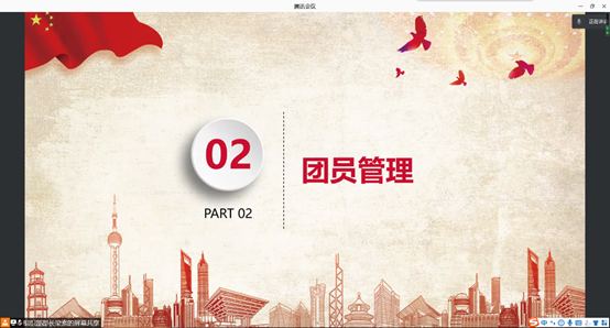 接下来,团委执行副书记张凌霓传达关于团员教育管理的内容。她指出,团支书应关注本团支部团员们的党史教育。第一是加强党的创新理论学习教育,加强党史节目、党史书籍等的学习;第二是要组织团员学习掌握马克思主义相关内容,树立员工应有的理想和目标,并主动与我国国情结合起来、与社会需要结合起来;第三是团支书应当引导团员坚持爱国和爱党、爱社会的高度统一。团支书在平时应树立榜样,文明绿色上网,不在网络上发表煽动性言论,组织团支部学习中华优秀传统文化,让整个团支部得到升华。同时,她还给团支书带来了一些关于团员日常教育管理的主要方式的建议。其中包括了组织生活、学习培训、团费制度以及组织关怀等形式。最后,她还强调了团员监督和组织处置。