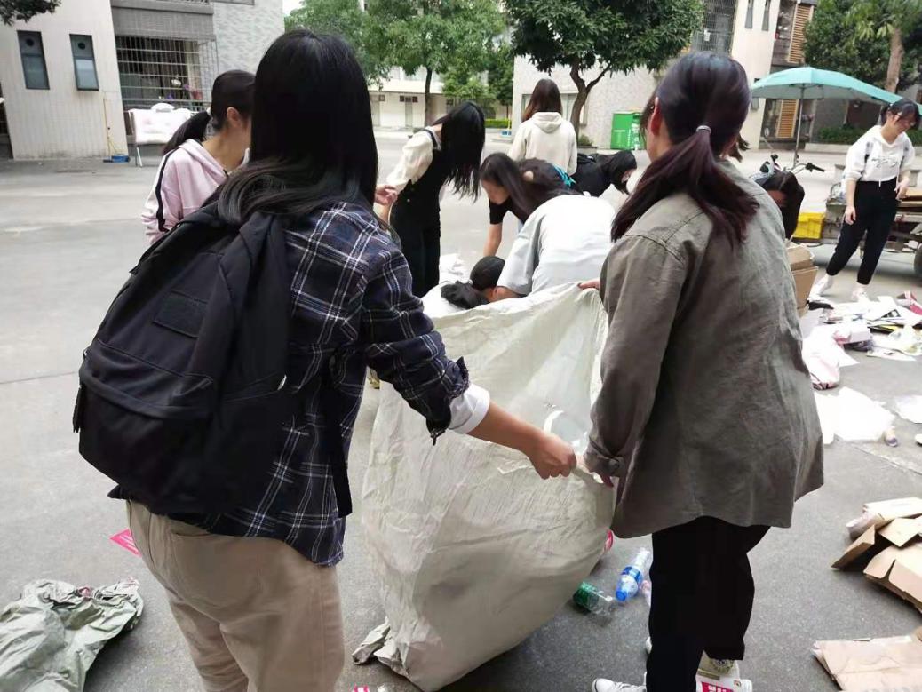 志愿者们以小组形式前往各个宿舍回收纸皮、瓶子等废品,他们满怀热情,充满干劲,伴随着同学们积极的配合,一袋又一袋的废品被搬运到三栋宿舍楼下整合、分类放置。最后再由工作人员将捆好的废品运回废品回收站,对废品加工再利用。