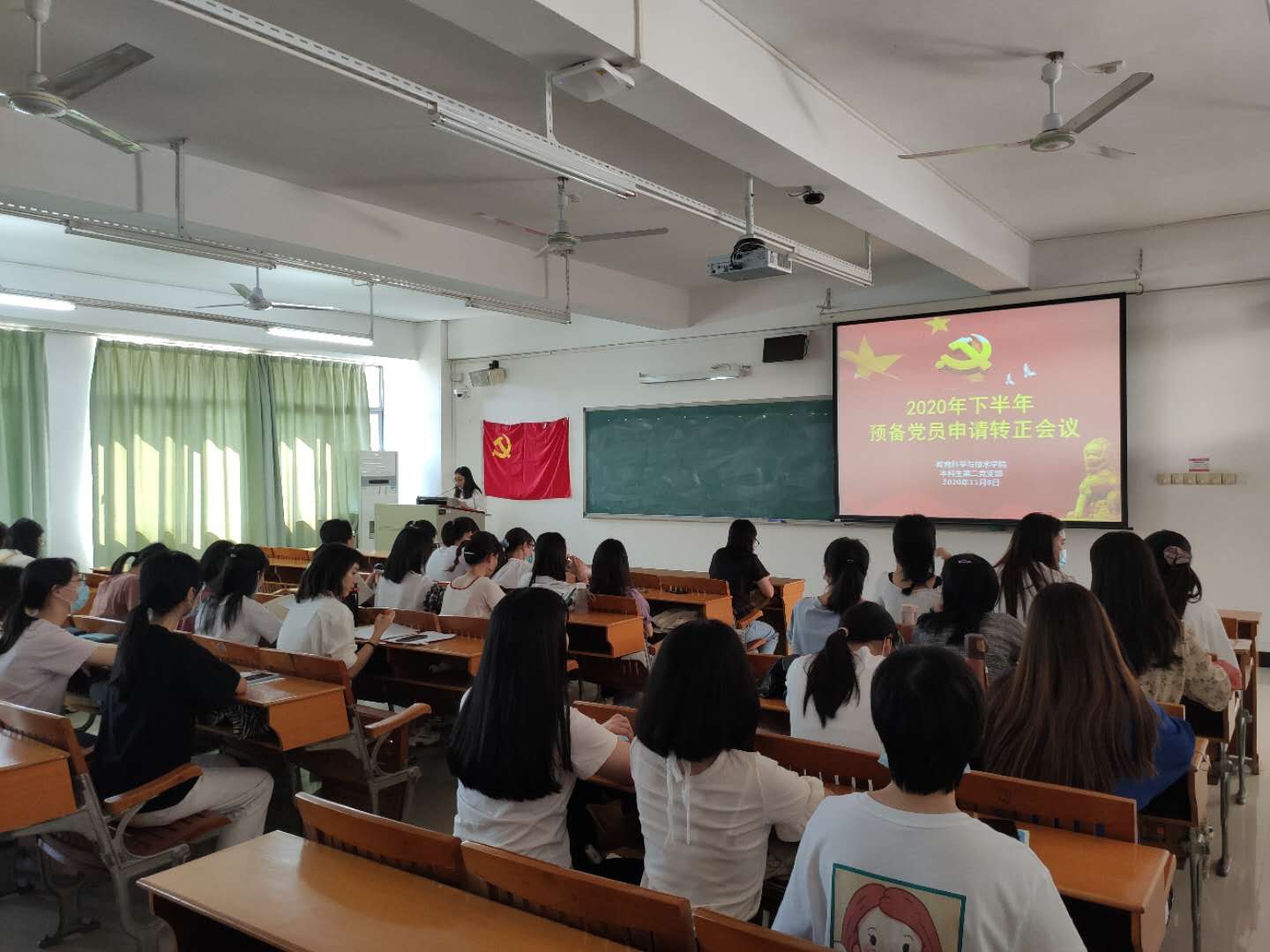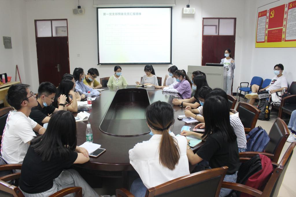 会议上,全体党员起立奏唱国歌。按照程序,12位预备党员逐一总结汇报了自己在预备期间的表现、思想认识、理论学习、实习生活情况,表达了对党的向往,对党的忠诚,表示将坚定不移跟党走,为党的工作奉献自己的力量,为共产主义事业奋斗终身。随后,入党介绍人分别汇报和介绍了预备党员的考察情况,提出了同意转正的意见。紧接着,与会党员对其转正发表了意见,认为他们符合中共正式党员条件,同意这12位同学按期转为中共正式党员。最后,全体与会正式党员进行投票,一致同意接收吴紫霞等12位预备党员为中共正式党员。