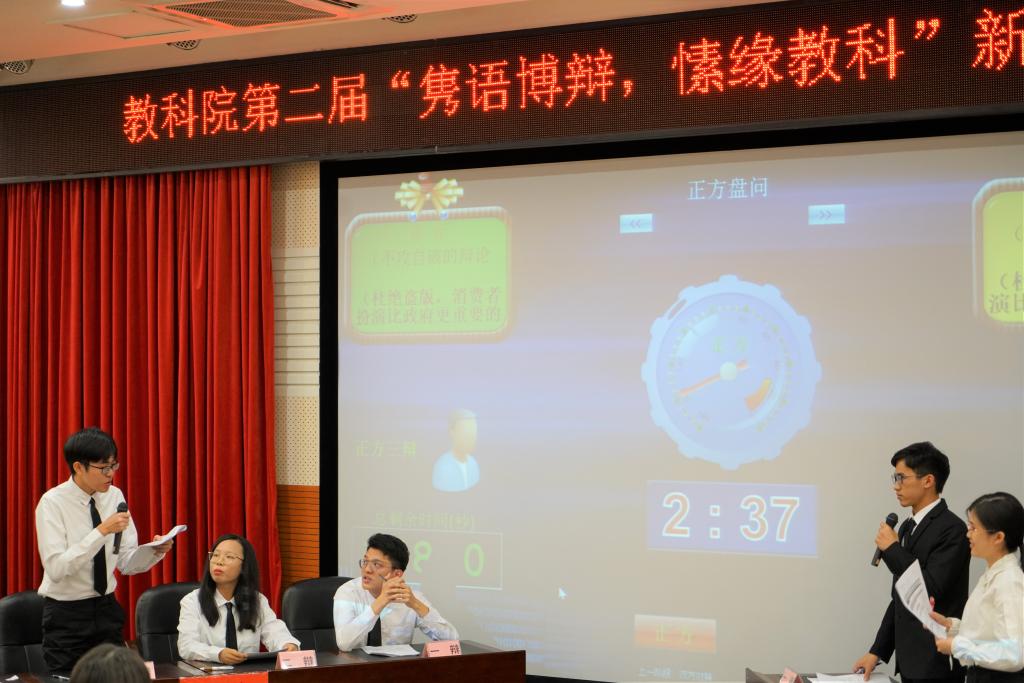 为了活跃公司文化气氛,丰富员工的课余生活,增强员工的明辨是非能力、逻辑思维能力和语言表达能力,提高员工的辩论水平,2019年11月29日晚上六点半,教育科学与技术公司(以下简称bevitor伟德国际1946)于白云校区第三教学楼104报告厅举办了以“隽语博辩,愫缘教科”为主题的第二届“新生杯”辩论赛决赛。本次比赛邀请到了bevitor伟德国际1946辩论队队长程佳弦、校辩论队副队长谢佳琪、bevitor伟德国际1946辩论队前队长王雪、管理公司辩论队副队长谢文毅、管理公司辩论队队员贾怡淩以及文学与传媒公司辩论队前队长姜涵担任评委,本次比赛邀请的嘉宾有团委执行副书记陈家劲、员工会主席冯琦琦、员工会副主席肖久雄以及各二级公司嘉宾。