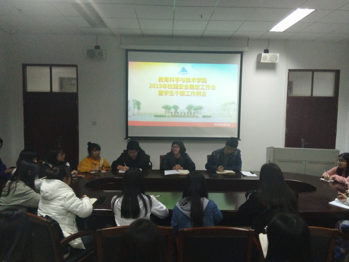 3月25日下午,教育科学与技术公司2017级和2018级全体员工干部主要成员在白云校区一教315会议室组织召开2019年校园安全稳定工作会暨员工干部工作例会,公司党委吴水爱副书记出席会议,会议由辅导员吴晨阳老师主持。