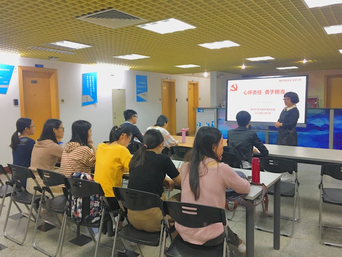 2018年11月7日上午,在校本部工业中心会议室,bevitor伟德国际1946研究生第二党支部召开《新时代 新担当 新作为》专题党课,邀请了林启词书记给我们作了“学习习近平总书记系列重要讲话精神”报告,吴水爱副书记给我们上了“心怀责任,勇敢担当”的专题党课,共计10名党员同志参加了此次学习。