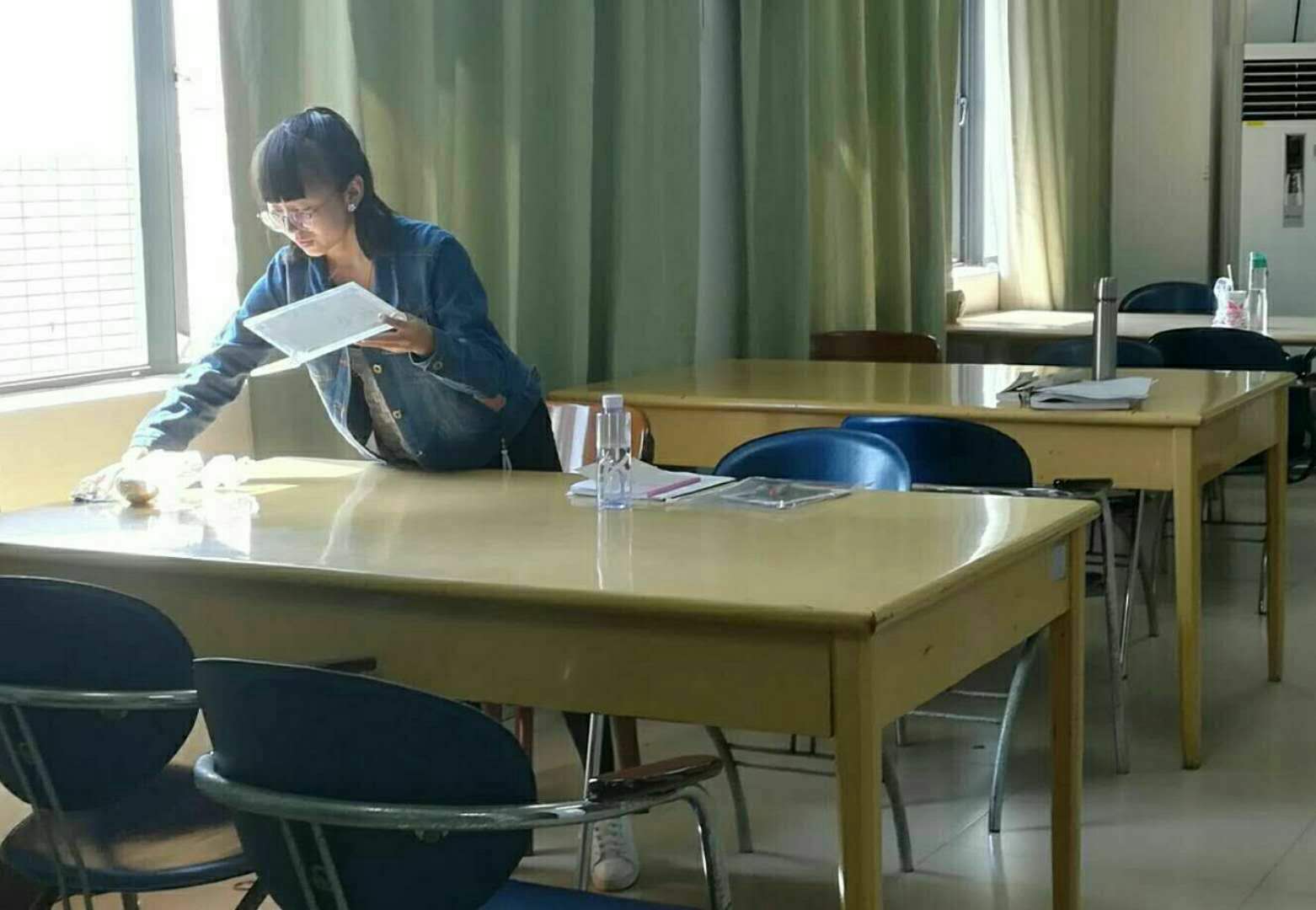 十月秋意渐浓,但参加图书馆清洁活动的同学们的工作热情却没有丝毫退减。在保持图书馆的安静的同时,他们耐心、认真地清扫、擦拭着每一块地板、每一张桌子,不放过任何一个角落。在清洁的过程中,在图书馆学习的同学十分体谅我们工作带来的些许噪音。在此感谢各位积极配合的同学和辛勤工作的志愿者,让活动圆满结束!