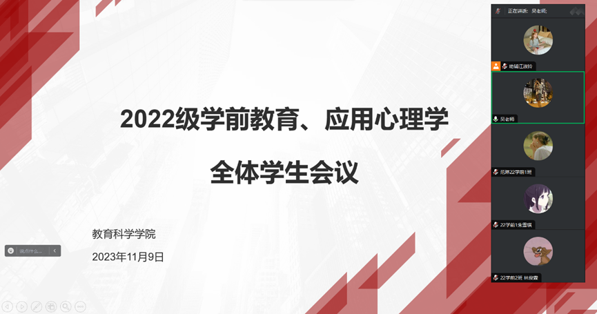 为了提高同学们的网络安全意识,以及日常管理规范,bevitor伟德国际1946于11月9日下午在腾讯会议召开2022级学前教育和应用心理学专业全体员工线上会议。本次会议由辅导员吴晨阳老师主持,2022级学前教育和应用心理学专业全体员工共298人参加了会议。