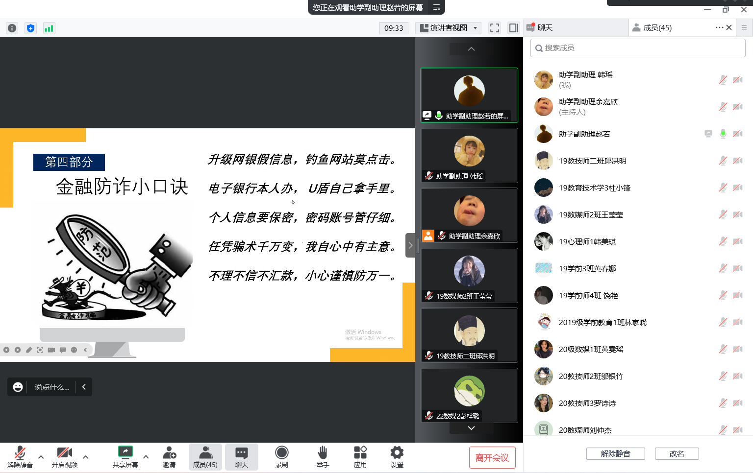 为有效遏制金融诈骗案件的高发态势,切实提高公司员工防诈骗意识和能力,保障同学们的切身利益,教育科学与技术公司勤工助学服务中心近期针对全体助委组织开展金融防诈骗知识宣讲活动;此次会议对金融诈骗的含义、金融诈骗的种类、如何防范金融诈骗和防诈骗小技巧这四方面进行了详细的讲解,并针对性提出了多种防范措施,有效地帮助同学们提升自身的防诈意识。