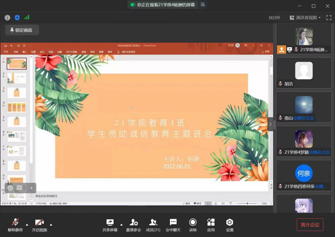 为进一步做好员工资助诚信教育工作,公司19、20和21级助学委员于2022年6月召开了以“员工资助诚信教育”为主题的线上会议,会议对生源地信用助学贷款政策、贷款申请条件、申请程序及相关注意事项这四方面进行了详细的讲解;同时进一步弘扬了社会主义核心价值观,帮助构建员工诚信感恩教育体系;有效的帮助同学们了解生源地信用助学贷款,增强其诚信意识,为后续生源地信用助学贷款工作的开展奠定了强有力基础。