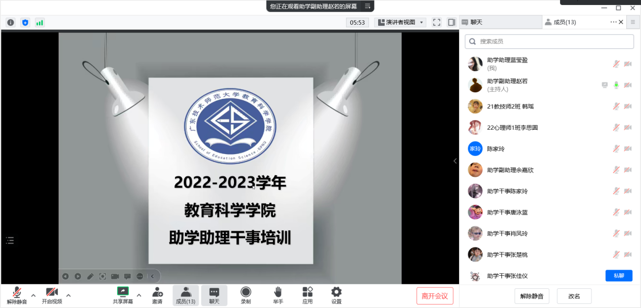为了深入开展助学服务工作,公司勤工助学服务中心在2023年3月9日晚上九点半召开了一次勤工助学服务中心助学助理干事培训会。本次会议总共分为5个环节,分别是公司领导介绍、公司助理团介绍、助学工作培训、助学日历和助学小组分享交流。这次会议不仅让助学干事们了解公司的领导老师和助学工作内容,还促进了勤工助学服务中心成员们的沟通和交流,便于公司后续助学工作的顺利开展。