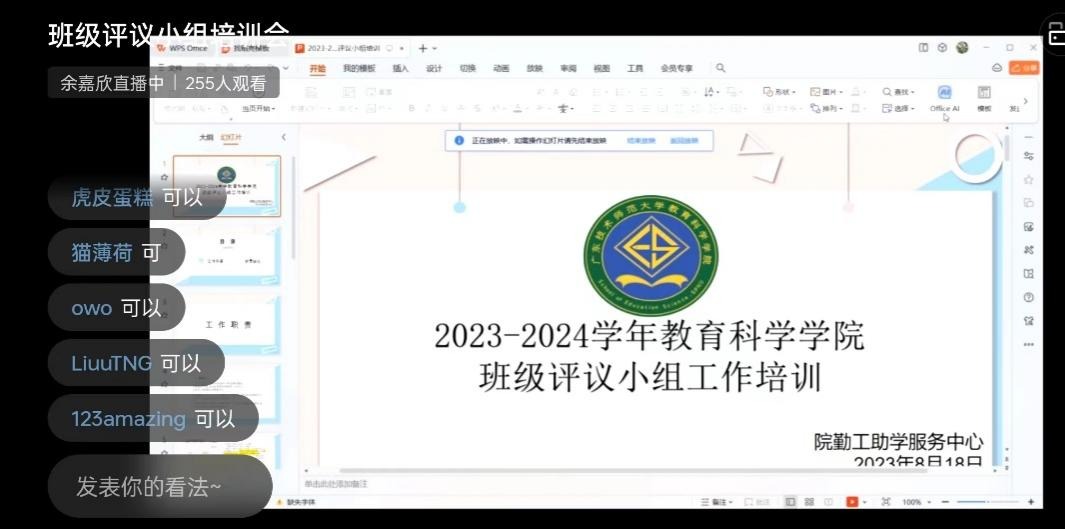 为了深入开展家困生助学工作,公司勤工助学服务中心于2023年8月18日晚上8点以企业微信直播的形式围绕“班级评议工作培训”主题对班级评议小组全体成员进行培训。此次会议的主要内容包括说明评议小组的工作职责、评议的注意事项和如何审核家困生材料等内容,帮助班级评议小组进一步熟悉评议的工作内容、具体流程等,为今后服务同学和协助院勤工助学服务中心的工作顺利进行提供了有力保障。