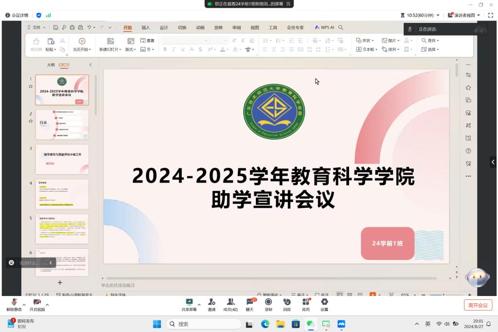 为推动2024—2025学年新生助学资助工作顺利推进,使新生全面了解资助相关事宜,公司勤工助学服务中心对助班进行培训并组织助班于2024年8月27日通过线上会议的方式,给各班新生召开了“2024-2025学年新生助学资助工作宣讲会议”。本次会议主要分为四个部分,分别是助学委员和班级评议小组工作、家困生认定申请工作、国家助学金和国家励志奖学金申请以及资助政策了解渠道。通过此次会议,新生对助学资助有了更清晰的了解,也进一步推动了公司新学年助学工作的顺利开展。