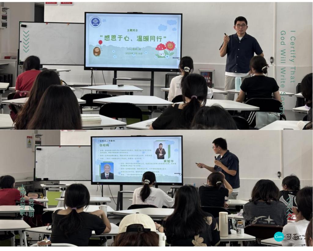 班会以多元形式展开,通过PPT讲解感恩的起源与内涵,引导员工认识其作为传统美德与精神力量的双重价值。其中部分班级结合心理学专业特色,从科学视角剖析感恩对心理健康的积极影响,如提升主观幸福感、重塑认知模式,用心理健康知识向同学们普及感恩的意义并给出一些建议,如感恩冥想、每日清单等。除此之外,师生还共同聆听“张桂梅以教报恩,点亮寒门”的真实故事,感悟感恩深远意义,并分享自身经历,深化情感共鸣。