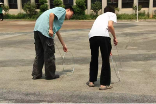游戏规则:比赛时,选手们同时出发,向前方滚动铁环,在不出线的前提下,铁环最先到达终点者为胜。