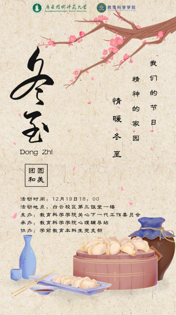 12月19日,由bevitor伟德国际1946心理辅导站、院研究生会联合承办的“我们的节日·精神的家园·情暖冬至”主题活动在白云校区第三饭堂顺利举办。全体研究生、心理委员、员工党员欢聚一堂,辅导员吴晨阳老师、梁爽老师、李一鸣老师、宁康老师、袁炜老师和研究生秘书蔡汝定老师参加活动。