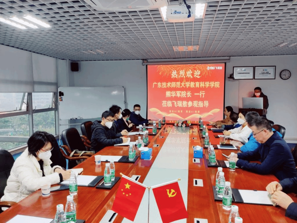 随后,双方举行了座谈会。会上,公司一行认真听取飞瑞敖公司的愿景与使命、发展历程、产品开发、荣誉资质等情况,了解到飞瑞敖公司在人工智能团队培训、竞赛培训、配套课程资源开发、线上学习平台建设、三大国赛的竞赛辅导(挑战杯、互联网+、创新创业大赛)、实训室建设等累累硕果。最后,熊华军经理就日后校企双方在中职人工智能课程建设、国赛辅导、产学研合作基地、校企实习岗位建设等方面进行了深入的交流。
