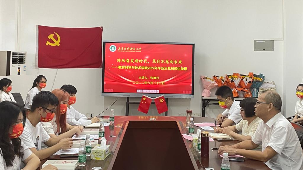 张旭日在认真听取了毕业生党员代表发言和师生交流后,对全体毕业生党员圆满完成学业、顺利毕业致以衷心的祝贺。同时为全体与会师生作了题为《踔厉奋发新时代,笃行不怠向未来》的专题党课,并对大家提出几点要求和期望。一是在德育方面,希望同学们能规范行为举止,在关键时刻站出来、冲上去;二是在智育方面,能贯彻终身学习的理论,引领行业的发展;三是在体育方面,要保持身心健康,练就好身体;四是在美育方面,能追求更高更完善的自己;五是在劳育方面,书记希望同学们能不断加强劳动教育,培养吃苦耐劳的精神。张旭日表示,不管同学们今后在哪个行业哪个地方,希望大家都能够做到“五育并举”,争做“四讲四有”的合格党员,在各领域中发光发亮,为实现中华民族伟大复兴的中国梦贡献自己的力量。