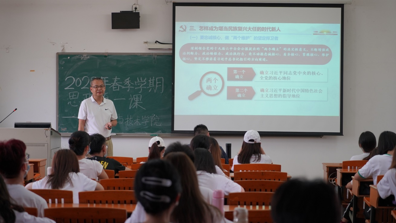 张旭日书记以《学习党的十九届六中全会精神,做堪当民族复兴大任的时代新人》为题,在课上论述了“为什么要抓好后继有人这个根本大计、如何抓好后继有人这个根本大计以及怎样成为堪当民族复兴大任的时代新人”这三个问题。他指出,后继有人是根本大计,是保证红色江山代代相传的根本,我们应当在传承中华优秀文化与面向新征程的过程中承担起培养人才的责任,一是要忠诚核心,做“两个维护”的坚定捍卫者;二是要筑牢理想,做马克思主义的坚定信仰者;三是要勇于实践,做新时代的坚定开拓者。张旭日希望同学们对党的十九届六中全会精神有进一步的领会,更加懂得从党的奋斗历程中汲取智慧和力量,以更加昂扬的姿态投身全面建设社会主义现代化国家、实现中华民族伟大复兴中国梦的新征程,以优异成绩迎接党的二十大召开。