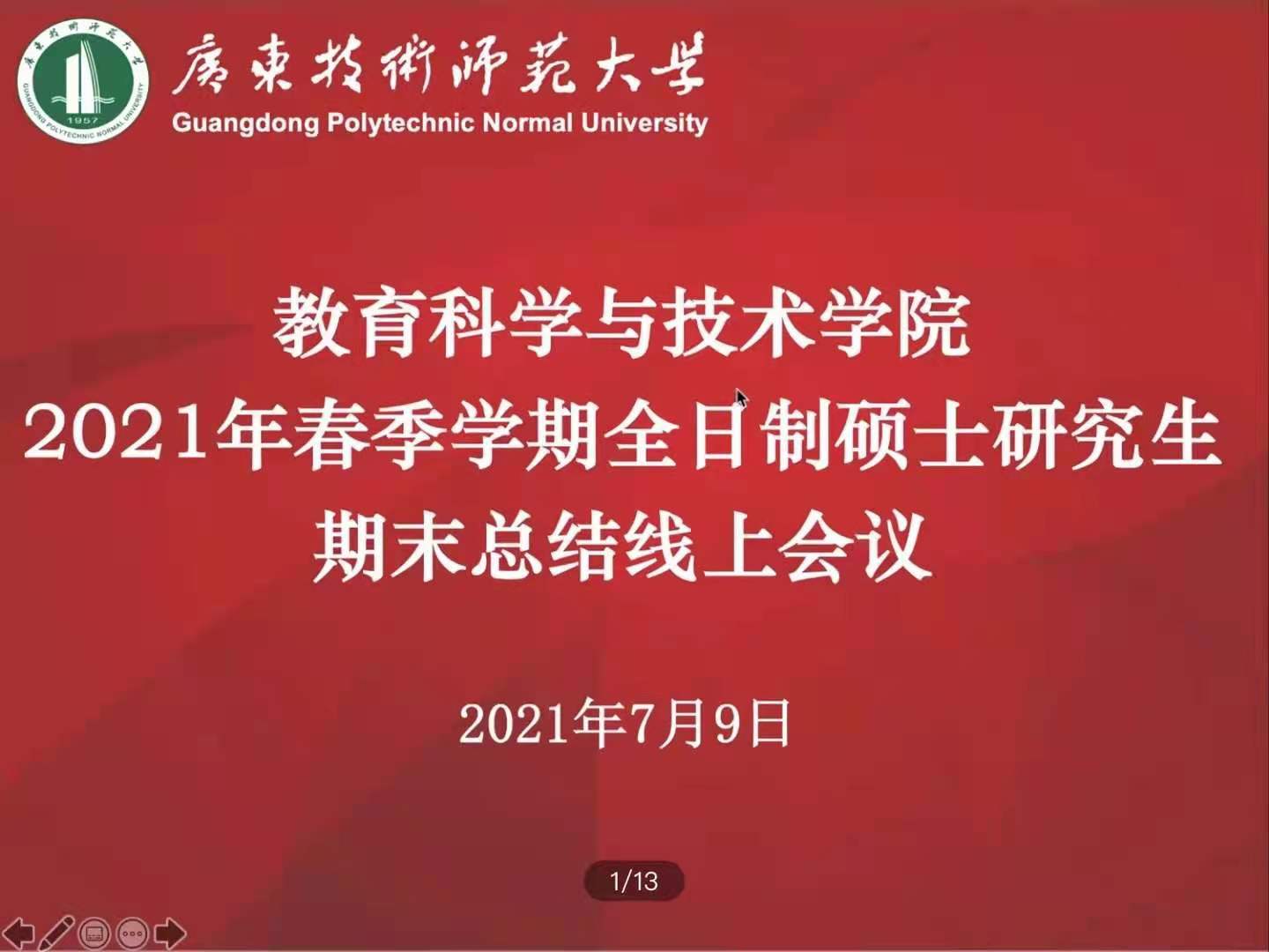 7月9日晚上,教育科学与技术公司在腾讯会议平台召开2021年春季学期全日制硕士研究生期末总结大会。会议由教育科学与技术公司副经理陈丽君主持,公司党委书记张旭日、经理陶红、公司党委副书记吴水爱,副经理谢德新、研究生教学部主任伍国华、研究生辅导员梁爽、研究生秘书刘品轩以及2019级和2020级全体全日制研究生参加了会议。