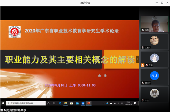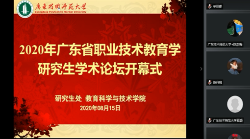 2020年8月15日至20日,由伟德国际1946bv研究生工作处、教育科学与技术公司举办的“2020年广东省职业技术教育学研究生学术论坛”通过腾讯会议平台顺利举办。教育科学与技术公司经理陶红教授、研究生处副处长陈泳竹教授以及项目主要成员出席开班典礼,来自云南师范大学、重庆师范大学、伟德国际1946bv的研究生学员47名参与会议、旁听会议者数名。陶红教授与陈泳竹教授先后进行开幕致辞。