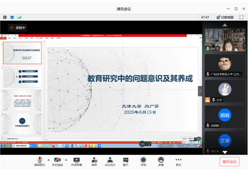8月20日下午,2020年广东省职业技术教育学研究生学术论坛闭幕式在线上顺利召开。教育科学与技术公司经理陶红教授、谢德新副教授、曹育红教授以及学术论坛学员47人参加结业典礼。结业典礼由谢德新副教授主持并宣读论坛优秀论文名单、关于同意颁发学员结业证书的决定。来自重庆师范大学的周可欣、云南师范大学的沈娟、以及本校的夏颖、方菁华、刘娟娟、冉燕、马洁、孙旭洋、邓小莉等9位学员代表先后就为期六天的论坛学习分享自己的心得、收获与期望。随后,研究生导师代表曹育红教授基于“道”“法”“术”“器”四点进行发言,向学员们分享理解世界、与世界打交道的思维模式与学习方法。最后,由陶红教授作总结发言。