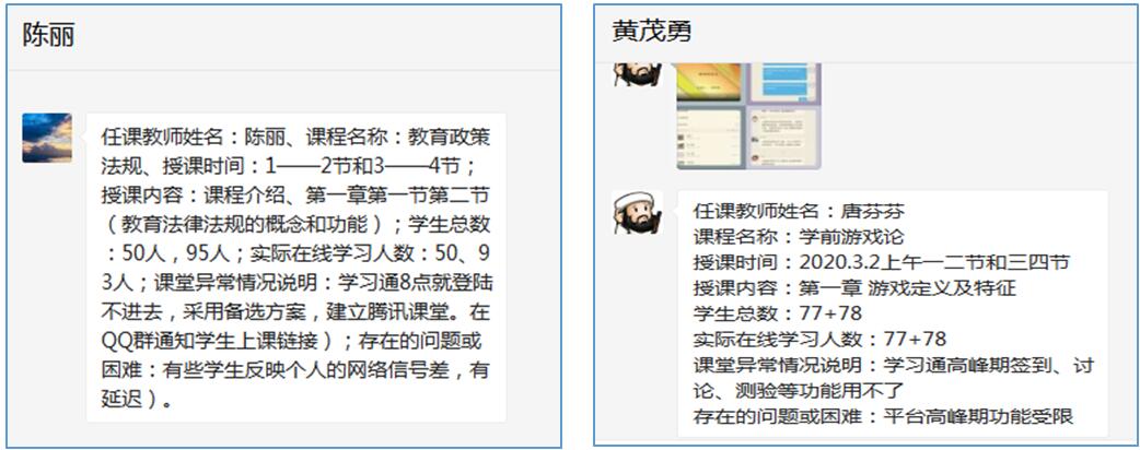 公司开展线上教学的全面监控,除监控工作小组外,各系部及公共课教研室每日反馈教师的上课情况,并在每周课程结束后上报本周的教学工作;教务员实时观看、课后追踪、沟通调查等方式,不定期抽查部分班级的教学情况,实时掌握在线教学的动态,做到“课课有监督”。此外,发挥各班学委和信息员的作用,及时反馈线上教学的情况,与线上教学监控小组工作形成互补,对线上教学监控做到全覆盖。