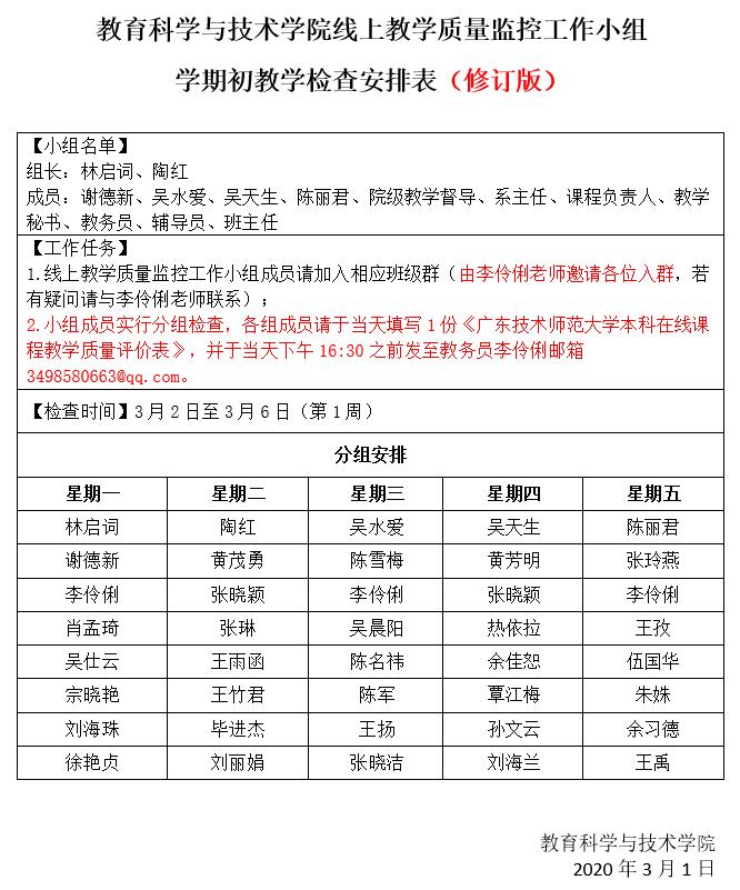 在现有线上教学质量保障体系的基础上,公司制定了本科线上教学质量监控实施细则,成立了林启词书记和陶红经理任组长,副书记、副经理、系主任、教学督导、课程负责人、班主任、教务员、辅导员等37人的质量监控小组。其中,线上教学质量监控小组成员分为5个小组,加入相应的上课班级教学群,每日参与听课观课,检查线上教学准备情况和线上教学运行与组织情况。同时,为了更好地开展教学督导工作,公司党政联席会议迅速任命新的教学督导成员,按公司要求开展督导工作。