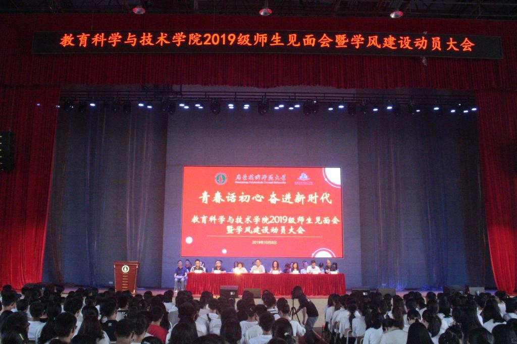 10月8日中午,教育科学与技术公司(以下简称为bevitor伟德国际1946)于员工活动中心一楼举行了“青春话初心,奋进新时代”2019级新生开学典礼暨学风建设教育。公司党委书记林启词、经理陶红、党委副书记吴水爱、副经理吴天生、副经理陈丽君、副经理谢德新,党政办公室主任常锋峰,系部中心主任、教师代表、19级新生班主任、教务员、辅导员参加会议,他们分别是陈军、伍国华、许成果、方向阳、赵志勇、黄芳明、徐艳贞、李灵丽、王国华、陈丽、李伶俐、吴仕云、吴晨阳、毕进杰、热依拉、王禹、余佳恕、王雨函、余习德、张晓颖、张琳、肖孟琦、梁爽等老师出席典礼。公司2019级507名全体新生和所有团学干部参加了开学典礼。典礼由公司党委副书记吴水爱主持。