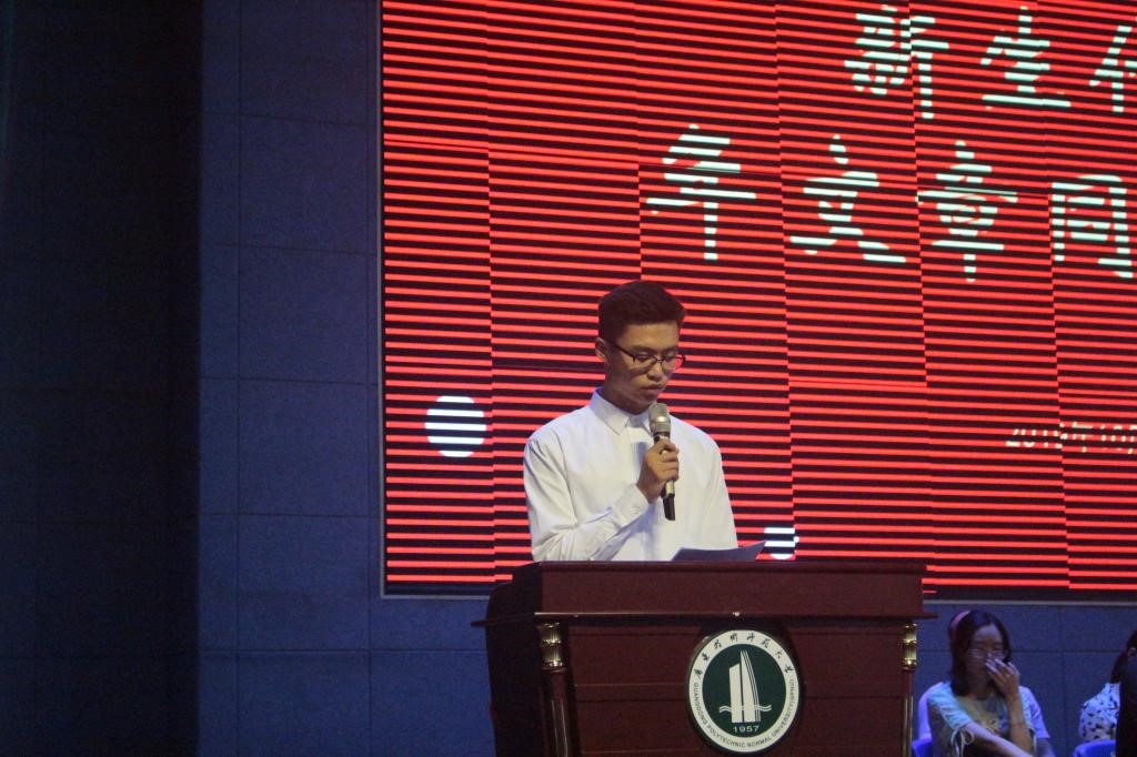 大会第五项,2019级新生代表年文章同学代表全体新生登台发言。首先他感谢了为他们的成长付出艰辛劳动的父母和老师,并表达了对进入伟德国际1946bv开始大学学习的美好憧憬。随后年文章同学代表全院507名新生庄严宣誓,用热血与汗水,铸就无悔的青春。希望同学们树立远大理想、志存高远,在大学新的起点,扣好人生的第一颗扣子。