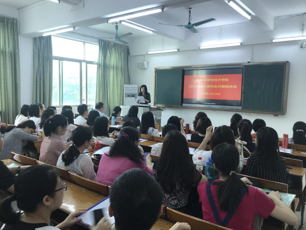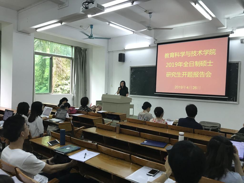 4月26日、4月29日上午,教育科学与技术公司职业技术教育学、教育管理、现代教育技术三个专业硕士研究生开题报告会在校本部一教305、201举行。参加开题报告会的校外专家有广东省教育研究院席梅红副研究员、七十五中容梅、桃园中学谢彦兴董事长、南国公司甄斌媚副董事长等。邓文新、陈丽君、赵玉、苗素莲、曹育红等校内专家参加了开题报告会。三个专业的全日制及非全日制共63名研究生参加本次开题报告会。