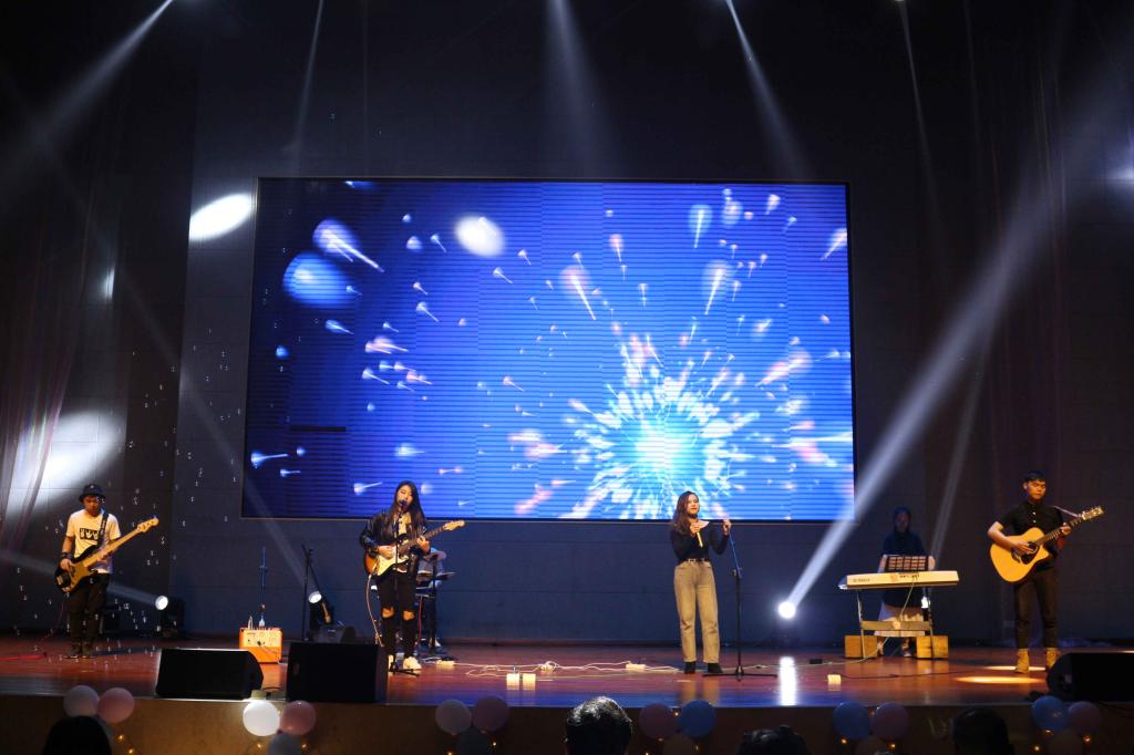 晚会由乐器队的几位青年带来的节目《星空》中拉开帷幕,他们在《星空》下诉说着面对未知未来的勇敢,镁光灯将整个舞台照得如同梦幻一般。现场观众迅速融入到了晚会的欢快气氛中,随之欢呼鼓掌。随后,院舞蹈队的舞蹈《V》、18级数媒师2班的《cups有点喜欢你》、16 级学前2班的充满童年回忆的《最美的光》与歌舞表演《恋爱歌舞剧》等同学们精心准备的节目一一登场亮相。这些节目涵盖了歌曲、舞蹈、歌舞剧等方面,充分展现了当代老员工应有的活力与朝气、团结进步,在初入校园后褪去稚气,起航新梦想,让青春绽放出精彩的光芒。