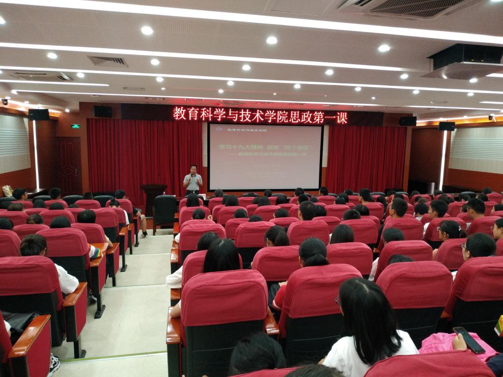 为全面深入贯彻学习习近平新时代中国特色社会主义思想和党的十九大精神,9月30日12时,教育科学与技术公司党委在白云校区第三教学楼104报告厅举行了以“学习十九大精神,坚定四个自信”为主题的思政学习第一课。出席本次思想政治教育第一课的有公司党委书记林启词、辅导员吴晨阳老师以及来自教育科学与技术公司18级教育技术师范3班、数字媒体技术1班、学前教育2班、应用心理1班和2班的全体同学。