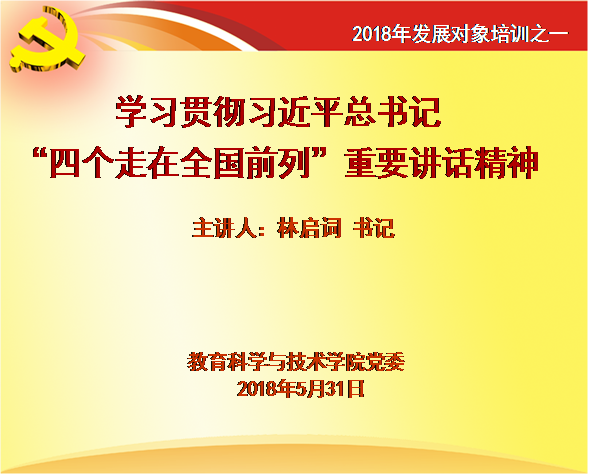 5月31日,公司党委在一教1412举办了2018年发展对象专题培训,根据《中国共产党发展党员工作细则》,公司上半年推选出16名发展对象(教工1名,员工15名)参加培训,党委林启词书记作了《学习习近平总书记“四个走在全国前列”重要讲话精神》专题讲座。