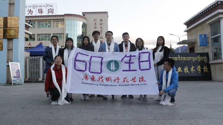 广技师援藏小分队在组长辜良丹的带领下,手工制作了祝公司60周岁生日快乐的校旗,表达了游子对母校最深沉的眷念。同学们在雪域高原,带上洁白的哈达,向神山祈愿,愿广东技术师范公司越来越好,再创辉煌。(通讯员:朱姝)
