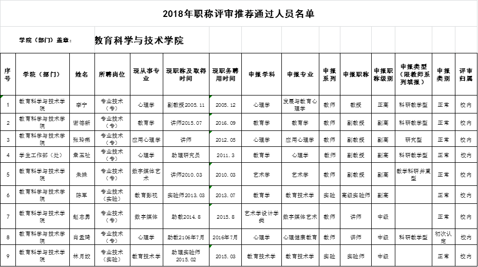 广东技术师范公司教育科学与技术公司职称评审工作小组初步资格审核,李宁等9名同志将推荐至公司职称评审委会进行评审(肖孟琦、赵志勇缺少继续教育证书,按人事处要求可以在9月底前交来,否则不能申报),现予公示。公示时间从2018年9月25日至10月8日止。若对评审推荐人员有异议,请电话或书面向下列有关部门反映。反映情况时要自报或签署真实姓名,要有具体事实;不报或不真实姓名的,以及不提供具体事实材料的,一律不予受理。情况反映的部门,电话和地址:公司党政办公室联系电话(传真):38256181;联系地址:校本部第一教学楼1408办公室
