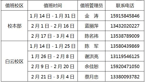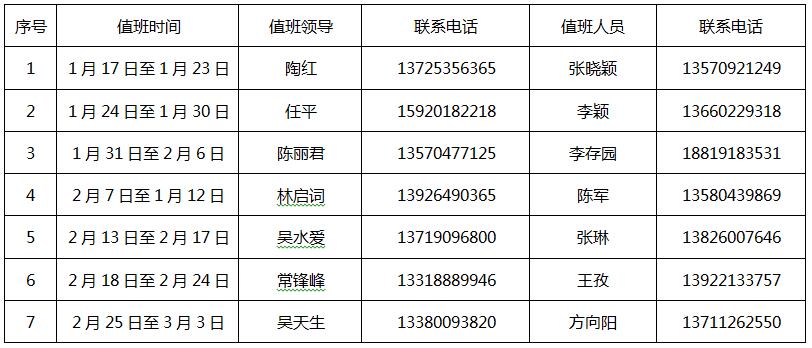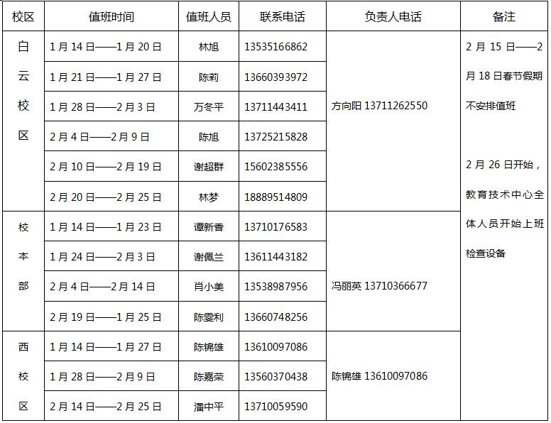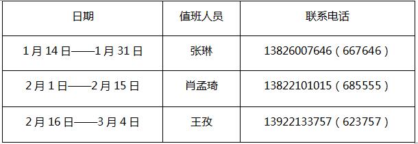 据公司放假安排,教师放假时间为2018年1月14日至3月4日。2018年寒假期间,实验室将不对外开放,实验设备一律不外借。寒假期间实验中心的值班安排情况如下: