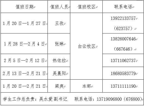 根据公司放假安排,教师放假时间为2019年1月20日至2月21日。寒假期间,实验室将不对外开放,实验设备一律不外借。寒假期间实验中心的值班安排情况如下: