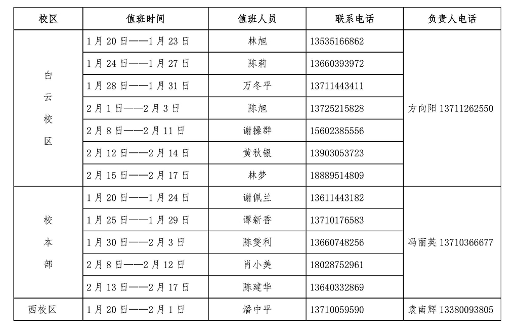 (四)请各实验、实训中心、教育技术中心做好假期值班安排和安全管理,在放假前须对重要场所进行一次防火防盗检查(详见公司关于2019年寒假放假及有关工作的通知和资产处关于做好2019年寒假期间实验室安全工作的通知)。员工口和研究生部安排好假期在校员工以及来校学习培训员工的安全教育和各项保障。