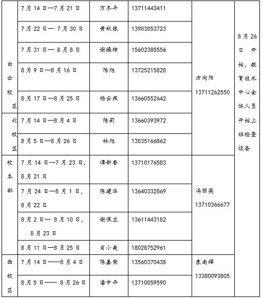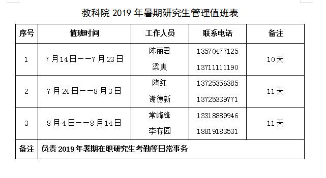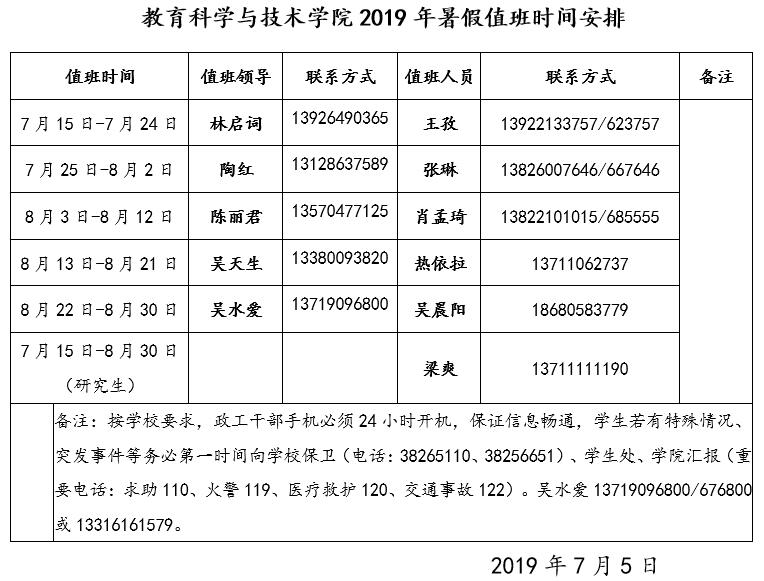 根据公司放假安排,教师放假时间为2019年7月11日至8月31日。暑假期间,实验室将不对外开放,实验设备一律不外借。暑假期间实验中心的值班安排情况如下: