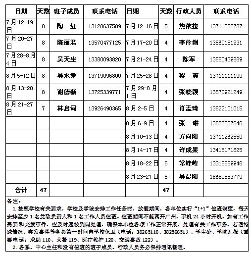 暑假时间为2020年7月12日至8月27日,放假期间,公司实行“1+1”值班制度,每天安排至少1名党政负责人和1名工作人员值班。值班期间不能离开广州,手机24小时开机。如有工作需要和突发事件,应及时返校到岗处理,确保本单位各项工作正常开展。