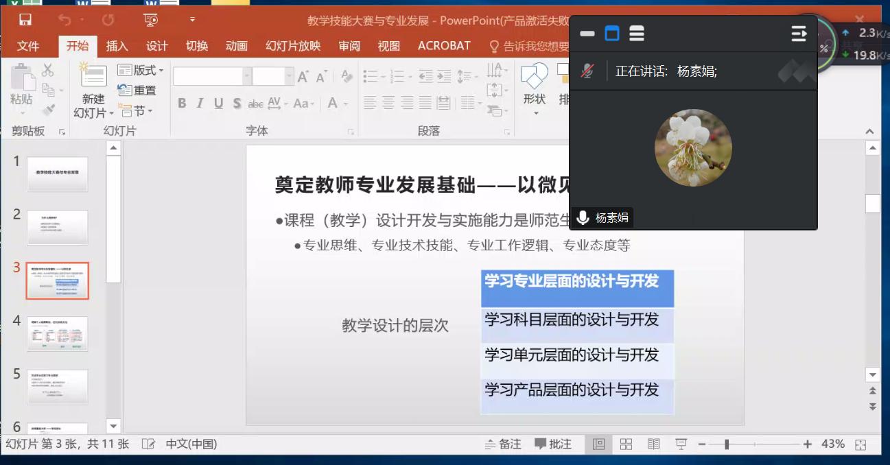 杨素娟老师首先总结了近些年公司研究生参加教学技能大赛所取得的经验和成绩,既肯定了公司在过去几届研究生教学技能大赛中所取得的优异成绩,也梳理了在备赛和比赛过程中的一些有益经验,给各位研究生的备赛工作提供了有利借鉴。同时也强调到研究生积极参加教学技能大赛的重要性,首先,研究生参加教学技能比赛有利于帮助自身奠定教师专业发展基础;其次有助于明确个人教育取向;最后,积极参与教学技能比赛可以帮助自身不断形成正确的专业态度和专业理想。