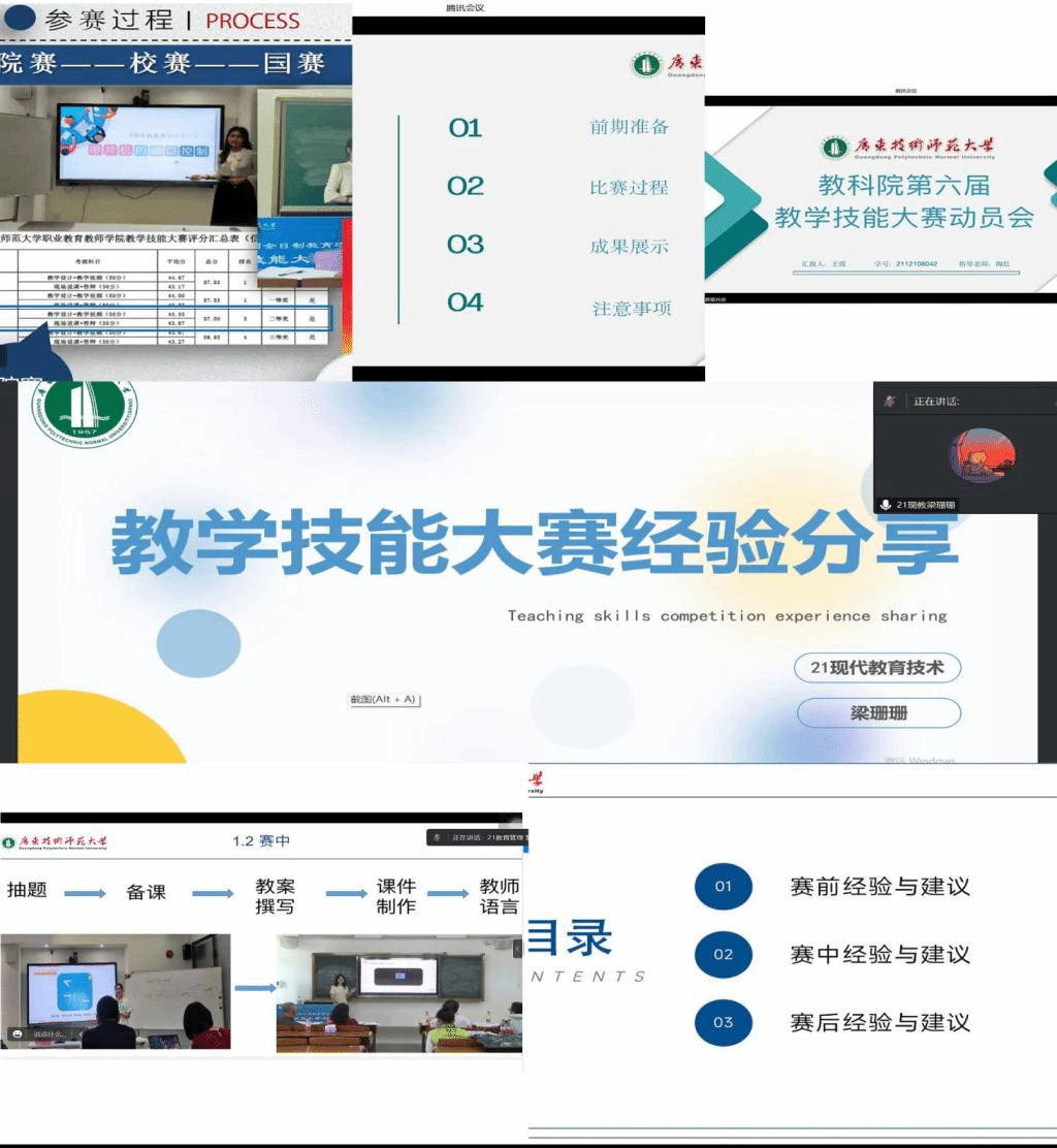 历届参加教学技能比赛的选手也分享了各自的备赛和比赛经验。2021级现代教育技术梁珊珊分别从比赛流程、如何准备以及比赛心得等三个方面向各位学弟学妹传授了相关经验。关于如何准备比赛,梁姗姗总结诸多干货,例如熟悉教材、观摩优质课、观摩参赛选手视频、学会总结和学会撰写优质教学设计等。2021级学前教育王霞围绕前期准备、比赛过程、成果展示以及注意事项等四个方面介绍了其比赛心得。王霞强调要注重对教学技能大赛规则的解读,与此同时要多磨课,学习优秀教学案例,最后还鼓励各位学弟学妹要沉着冷静,耐心应对此次大赛。2021级职业技术教育(电子与信息)梁宇铭主要从参赛过程和比赛心得这两个方面向大家做了介绍,她表示教学技能大赛是促进个人教学成长和综合能力提升的重要平台,同时她也提出了几点比赛心得,一要认真选题和审题,二要注重学习他人优秀经验,多与他人交流沟通,三要相信自己,努力克服恐惧和焦虑。2021级教育管理王慧婷围绕赛前、赛中和赛后三个阶段向大家介绍了她的参赛经验。首先是赛前准备,参赛选手要系统扎实地学习和整理相关学科的理论知识,掌握学科前沿教学理念、素养要求、方法、各学段员工的学习和性格特点等;其次是赛中阶段,要注意备课时间和展示授课的时间,把握好授课的基本要点及教姿教态;最后是赛后阶段,及时总结反思,加强与同伴的共享和交流,促进共同进步。