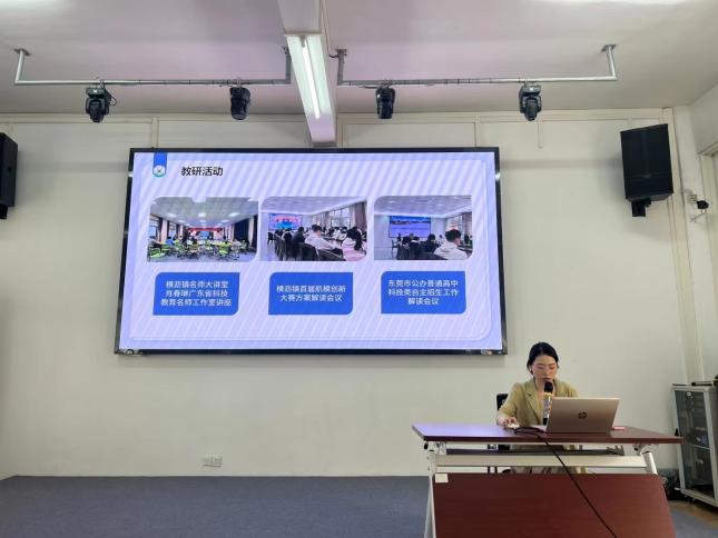 在东莞横沥中学实习的2021级现代教育技术专业7位研究生分别就各自的选题介绍在实习期间所参与的比赛项目及论文的进展及成果介绍,实习生蔡汝定表示,在陈建平主任和肖春琳老师的指导下,积累了带队比赛的经验的同时掌握了各种技能,通过自身的不断努力有力推动了毕业论文研究的开展。