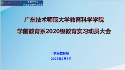 2023年7月3日星期一下午,学前教育系举行2020级师范生教育实习动员大会。公司副经理谢德新、系主任黄茂勇、专业负责人徐韵莹、学前教育系全体专任教师及2020级全体员工参加了会议。