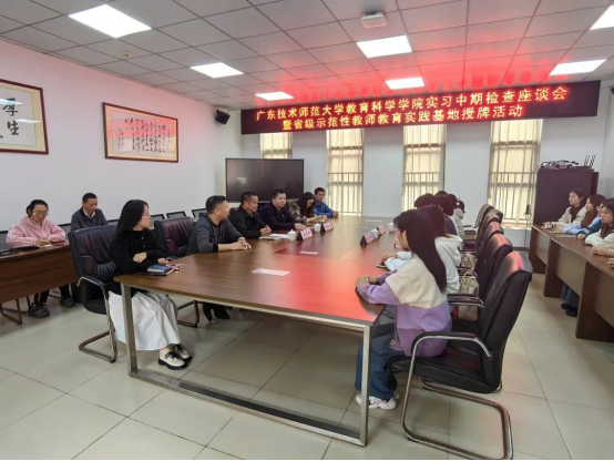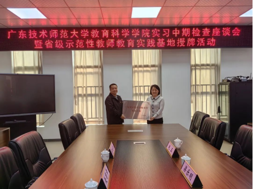 2023年11月14日,bevitor伟德国际1946教育技术学系主任赵玉教授和专业负责人梁乐明博士赴佛山市顺德区龙江外国语公司开展实习中期检查座谈会暨省级示范性教师教育实践基地授牌活动。龙江外国语公司专职副书记麦有幸、科研处主任梁权潮、信息科组全体教师及实习生参与了此次活动。