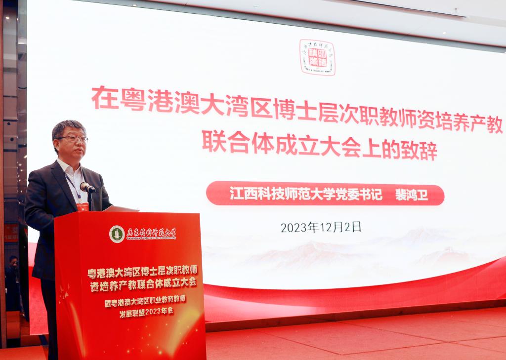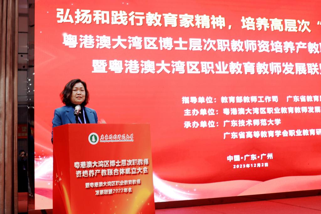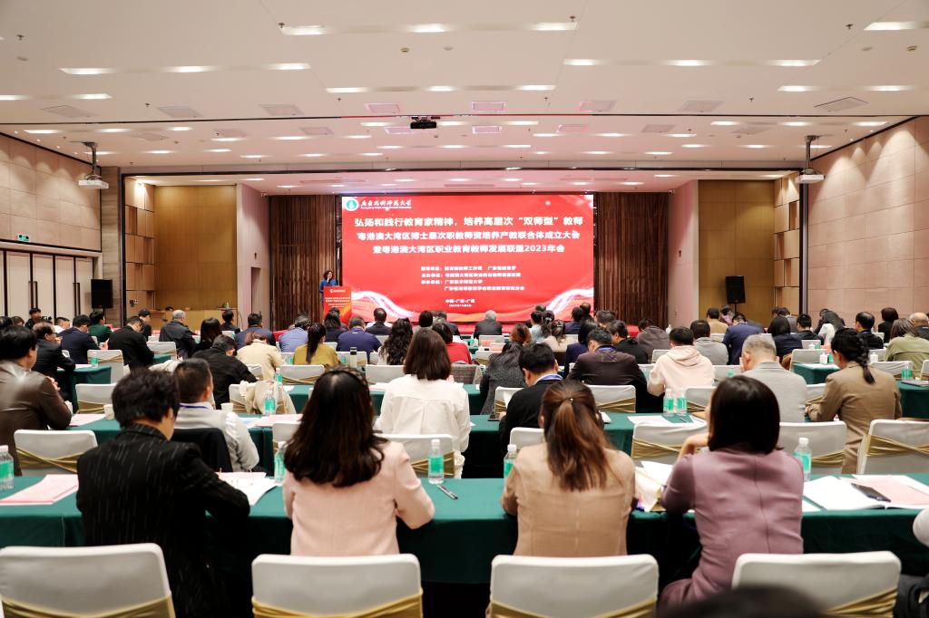 高素质“双师型”职教团队是职业教育高质量发展的关键支撑。为进一步加快建设教育强国,促进粤港澳大湾区教师教育融合发展,探索粤港澳大湾区博士层次“双师型”职教团队培养的新理念、新机制和新路径,更好地为职业公司培养学术知识扎实、专业技能突出、教育情怀深厚、数字化素养良好的“双师型”工匠之师,12月2日,粤港澳大湾区博士层次职教团队培养产教联合体成立大会暨粤港澳大湾区职业教育教师发展联盟2023年会在广州举行。本次大会以“弘扬和践行教育家精神,培养高层次“双师型”教师”为主题,来自全国各地的专家学者、企业高管、高校师生代表200余人参加了大会。