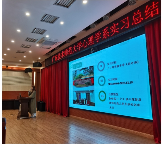 首先,章玉祉副教授发表讲话,她从教育实习的本质和意义出发,强调了教育实习的重要性,就教育实习过程中规范教学实习安排,加强实习组织管理,提高教育实习成效提出了更高要求。接着,十三个实习点的实习小组,每组派出一个代表进行8分钟的实习教育总结。各小组对为期16周的实习进行总结,介绍了实习期间的教学工作、班主任工作、公司产品研究、心理咨询等方面的收获,分享了课堂教学设计和课堂管理以及危机干预等方面的实习经验。最后,在心理系每位老师的评选下,选出两名校级优秀实习生,分别是在广州市纺织服装职业公司实习的阿布同学和在广二师附属实验中学的罗文慧同学。